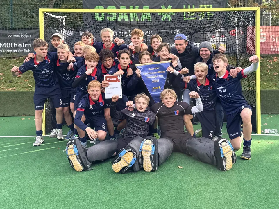 Meister 2023, 2024 und erneute 2025 – das schaffte auch die Männliche U16 des HTC Uhlenhorst Mülheim. Im Endspiel in Aachen wurde der Harvestehuder THC dank des frühen Treffers von Hans-Friedrich Prieur (12.) mit 1:0 geschlagen.